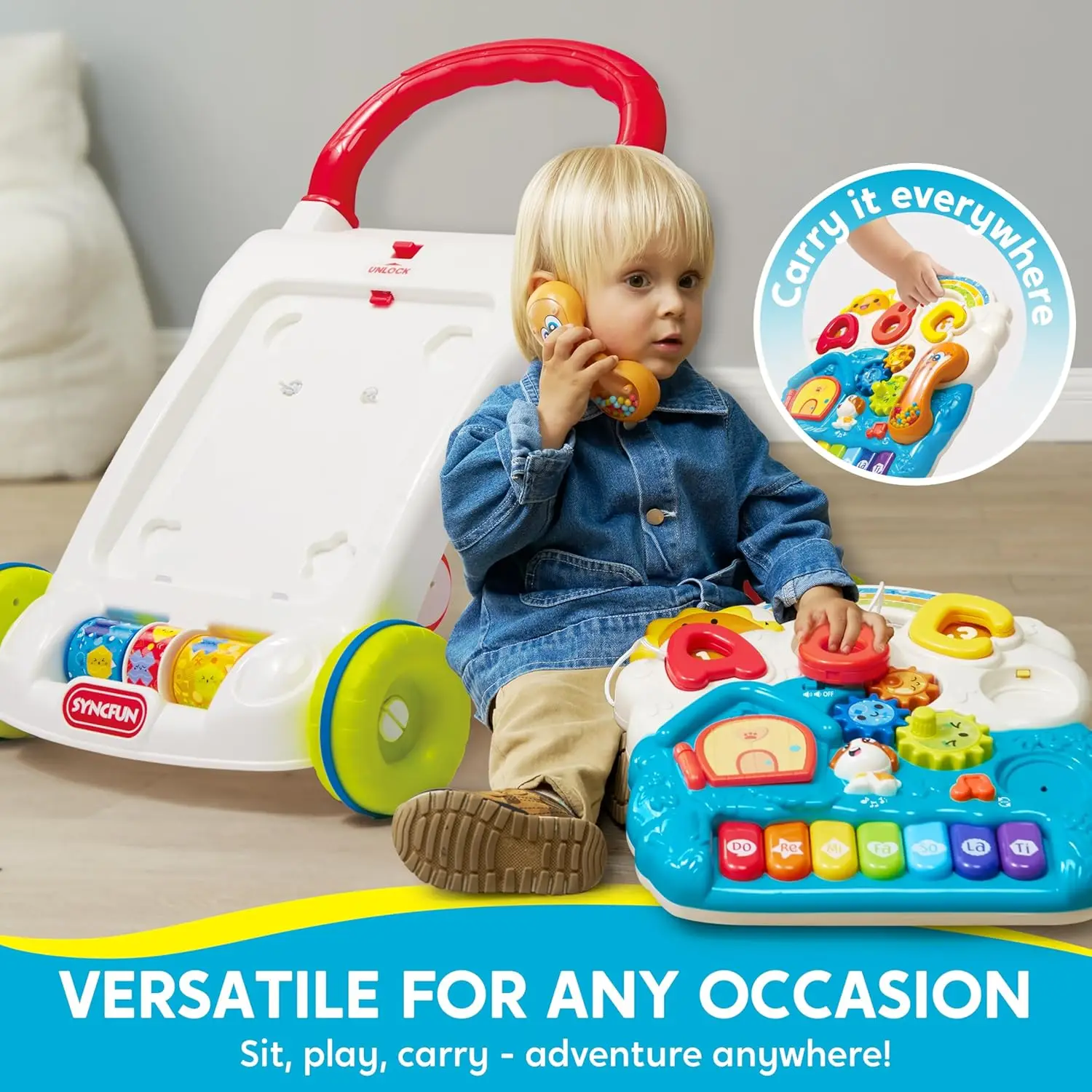 Engaging Audio-Visual Play: Equipped with light-up buttons, sound features, and a piano panel with seven modes, this walker for baby boys and girls provides endless entertainment. ABC buttons, rolling wheels, and a phone with interactive sounds make it a good choice for baby toys